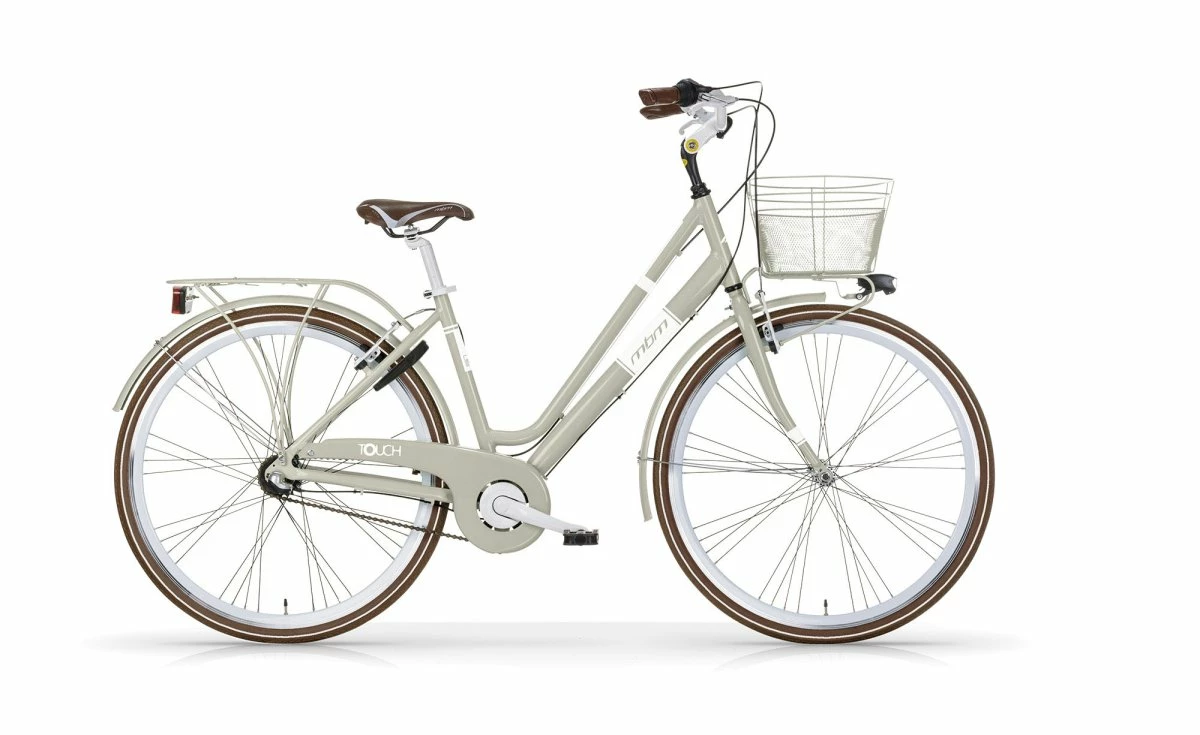 ny Alu Ladies Model med retro look, 3 hastighed. Shimano Nexus FW , kassette-trapper, alu V-bremser og bremsehåndtag, justerbar stamme, brune anti-slip-pedaler, brun sadel Selle Bassano, alu dobbeltvæggede fælge, reflekterende dæk, robuste hoofing-slot, basket front.